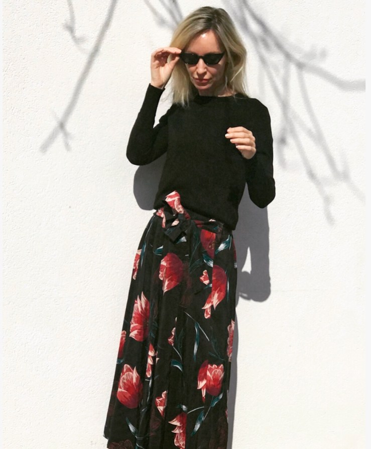 If, like me, you’ve been accustomed to wearing black pant + black sweater + black jacket combos over winter then the thought of switching up to floral prints for Spring is both compelling and confounding. Melbourne weather veers from mild to chilly to downright arctic until December, a maxi skirt is just the thing for Spring and I’ve found one with a tulip print on black to ease me out of my block black wintery wardrobe and into a jot of colour. Maxi skirts are fashion gold; classic chic, flattering, trans-seasonal and comfy as heck. I’m wearing la swish with sneakers by day and kitten heels for a night out π